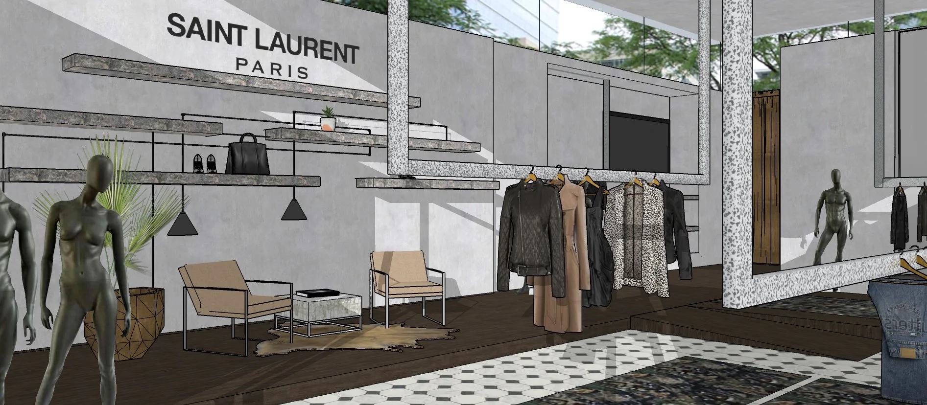 This Saint Laurent pop-up was inspired by the 2018 Spring runway show and features elements that highlight the ready-to-wear line and represent the fashion house.